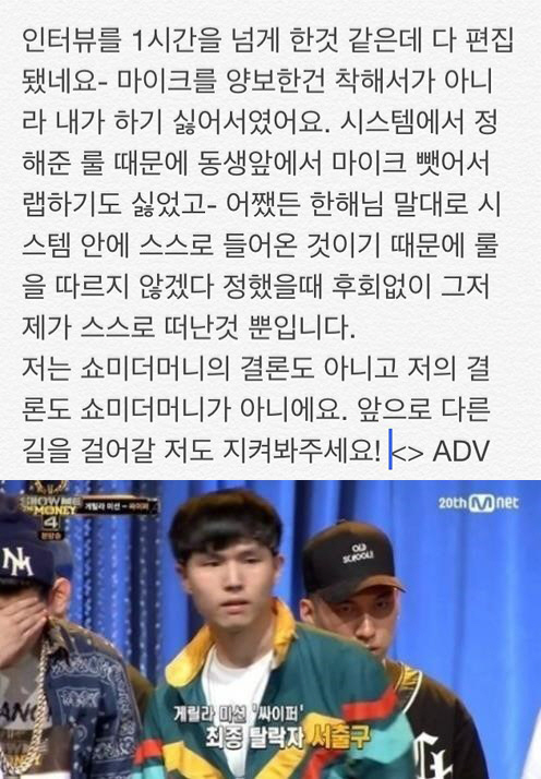 서출구는 자신의 인스타그램을 통해 "인터뷰를 1시간 넘게 한 것 같은데 다 편집됐네요. 마이크를 양보한 건 착해서가 아니라 내가 하기 싫어서였어요. 시스템에서 정해준 룰 때문에 동생 앞에서 마이크 뺏어서 랩하기도 싫었고…"라며 "어쨌든 한해 님 말대로 시스템 안에 스스로 들어온 것이기 때문에 룰을 따르지 않겠다 정했을 때 후회 없이 그저 제가 스스로 떠난 것뿐입니다. 저는 쇼미더머니의 결론도 아니고 저의 결론도 쇼미더머니가 아니에요. 앞으로 다른 길을 걸어갈 저도 지켜봐주세요"라는 심경글을 올렸다.