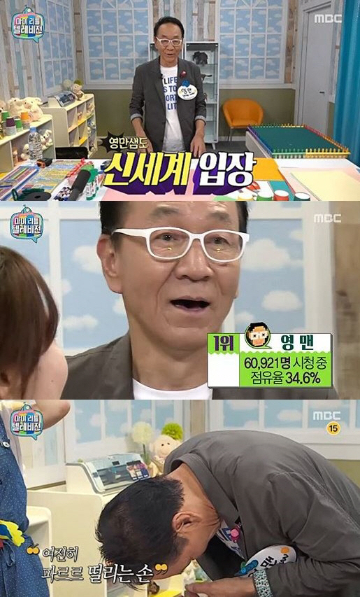 18일 방송된 MBC '마이 리틀 텔레비전'에서는 김영만 종이문화재단 이사가 종이접기 1인 방송을 했다. "코딱지들이 이제 2~30대가 돼 결혼도 하고 아이도 있을 것 같아 출연이 망설여졌다. 그 친구들이 나를 똑같이 봐줄까 궁금해 흔쾌히 승낙했다"던 그는 백종원의 자녀를 위해 종이 모빌을 선물하는 한편 동그라미 왕관 비행기, 스냅 백 등 다양한 종이접기를 선보이며 향수를 자극했다. 특유의 유쾌한 진행은 KBS1 'TV 유치원 하나 둘 셋' 출연 당시의 모습 그대로였다. 세월은 흘렀지만 프로그램 방송 시간이면 색종이를 들고 TV 앞에 모였던 어린 시절의 추억을 떠올리게 한 것. 백종원 아내 소유진마저 남편의 방송 대신 김영만의 방송을 봤다는 걸 SNS를 통해 인증했을 정도다. 이날 전반전 결과 김영만은 34.6%의 시청률로 2위를 기록했다. '천상계' 백종원을 제외하면 '인간계'에서는 1위다. 녹화 도중 서버 폭주로 방송이 잠시 중단되기까지 했던 저력을 발휘한 것. 이에 뜨거운 눈물을 쏟아내기도 했다.