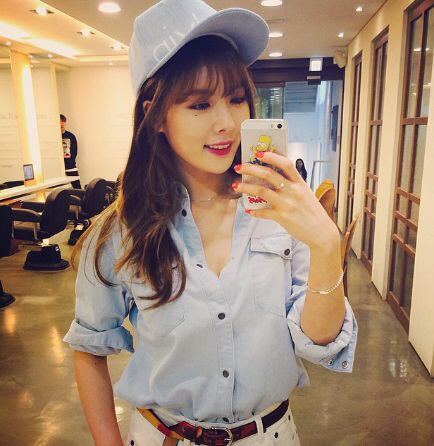 스마트폰을 이용해 거을 앞에서 셀프 카메라를 찍는 현아의 모습입니다. 연청은 캐주얼하면서도 소녀스러움을 어필하기 가장 좋은 아이템인데요, 그녀는 연청 셔츠 소매를 롤업하여 캐주얼한 느낌을 가득 살렸습니다. 이에 같은 컬러 스냅백을 매치하여 귀여운 느낌을 강조했네요. 상큼한 오렌지 컬러의 네일아트와 간단한 액세서리를 통해 세심하게 스타일링을 신경 쓴 모습입니다. 데님 셔츠와 모자는 캘빈클라인 진 제품.