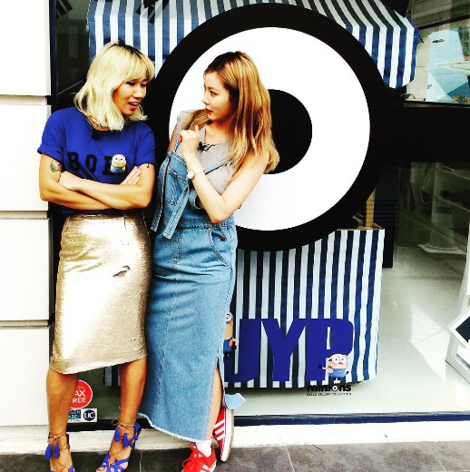 평소 친하게 지내는 디자이너 요니P와 평소 즐기는 데님스커트를 입었지만 이 날의 스커트는 발목까지 오는 긴 길이감으로 더욱 여성스러운 느낌입니다. 옆 라인은 트여있어 활동하기에 편할 것 같네요. 신발은 레드 컬러의 운동화로 스포티한 매력까지 더했습니다. 데님스커트는 SJYP제품. .