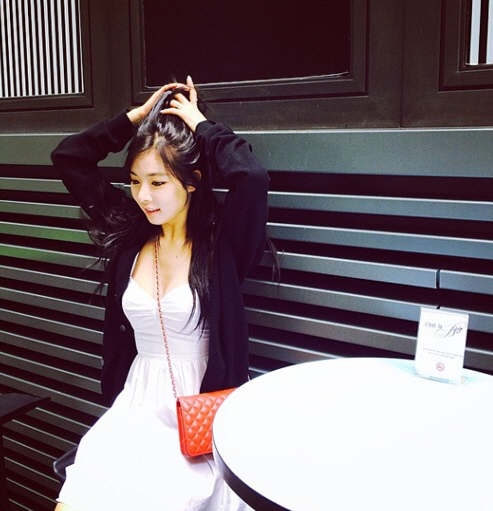 여자들이 머리를 올려 묶는 모습에 남자들은 반한다죠? 화사한 화이트 컬러 뷔스티에 원피스와 블랙 카디건을 매치하여 섹시하기도 하고 청순하기도한 그녀만의 매력 어필중입니다. 오렌지컬러의 퀄팅 미니백으로 역시나 상큼한 포인트를 놓치지 않았습니다. 은근히 로맨틱한 느낌까지 드네요.미니백은 샤넬. 원피스는 아메리칸어패럴 제품.