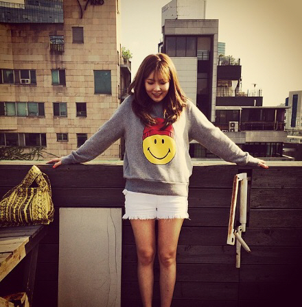 해질녘, 오후 시간의 여유를 즐기는 현아의 편안한 패션입니다. 비니를 쓴 깜찍한 스마일 캐릭터가 돋보이는 그레이 맨투맨 티셔츠에 화이트 숏팬츠를 매치했습니다. 맨투맨은 AMI 제품.