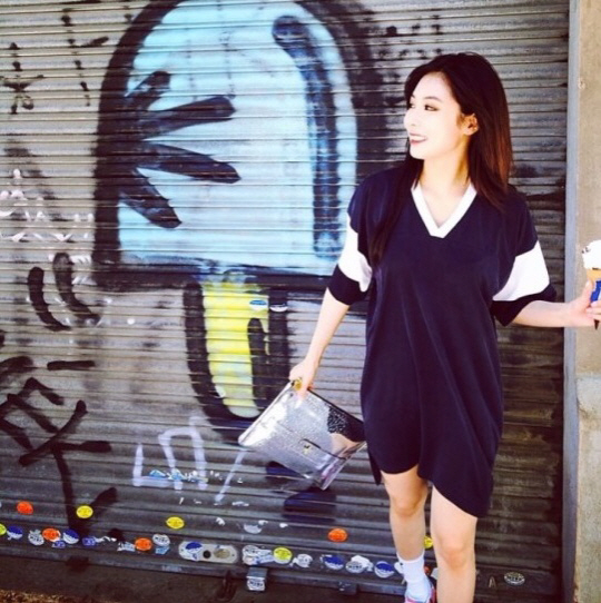 현아의 스트릿 패션은 뭐다? 하.의.실.종이네요. 티셔츠인 듯 원피스인 듯 긴 길이감의 짙은 네이비 배색 티셔츠로 스타일리시한 면모를 뽐냈어요. 네크라인과 소매 배색이 트렌디할 뿐 아니라 독특한 사각 미러 클러치를 손에 쥐어 유니크한 매력까지 더했네요. 거리와 어울리는 트렌디캐주얼 룩. 티셔츠는 알렉산더왕 제품입니다.