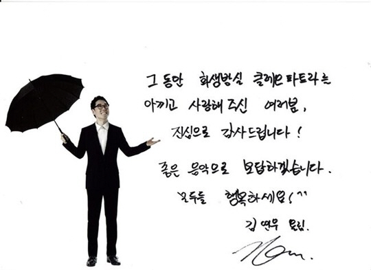 김연우는 "그동안 화생방실 클레오파트라를 아끼고 사랑해주신 여러분, 진심으로 감사합니다. 좋은 음악으로 보답하겠습니다. 모두들 행복하세요!"라고 적었다.