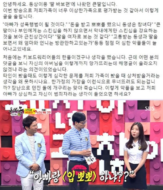 큰딸은 18일 자신의 페이스북을 통해 "이번 방송으로 저희 가족이 너무 이상한 가족으로 평가받는 것 같아 이렇게 글을 올린다"며 자신의 심경을 고백했다. 그는 "'아빠가 성폭행범이 될 것이다', '돈을 받고 뽀뽀를 했으니 동생은 창녀다', '큰딸이나 부인에게는 스킨십을 하지 않으면서 막내에게만 스킨십을 강요하는 것을 보아 근친상간이다', '딸을 여자로 보는 것 같다', '고통받는 동생과 딸을 보면서 왜 엄마와 언니는 방관만 하고 있는가' 등등 점점 더 심한 악플들이 늘어나고 있다"고 운을 뗐다. 이어 "처음엔 키보드 워리어들의 한풀이겠구나 생각했다. 그런데 어떤 분의 댓글을 보니 '자신의 아버님을 이렇게까지 망가뜨리는데 해명글이 올라오지 않겠냐'라는 말이 있었다. 타인이 봤을 때도 이렇게 심각한 문제를 저희 가족이 봤을 때 상처받을 거라는 생각을 왜 못하나. 한가정의 가장을 이런 식으로 무너뜨려도 되는겁니까. 장난으로 던진 돌에 개구리는 맞아 죽는다. 이렇게 악플을 보고 저희 아빠가 상심하고 자신이 범죄자란 생각이 들었으면 하는가"라고 분노했다.