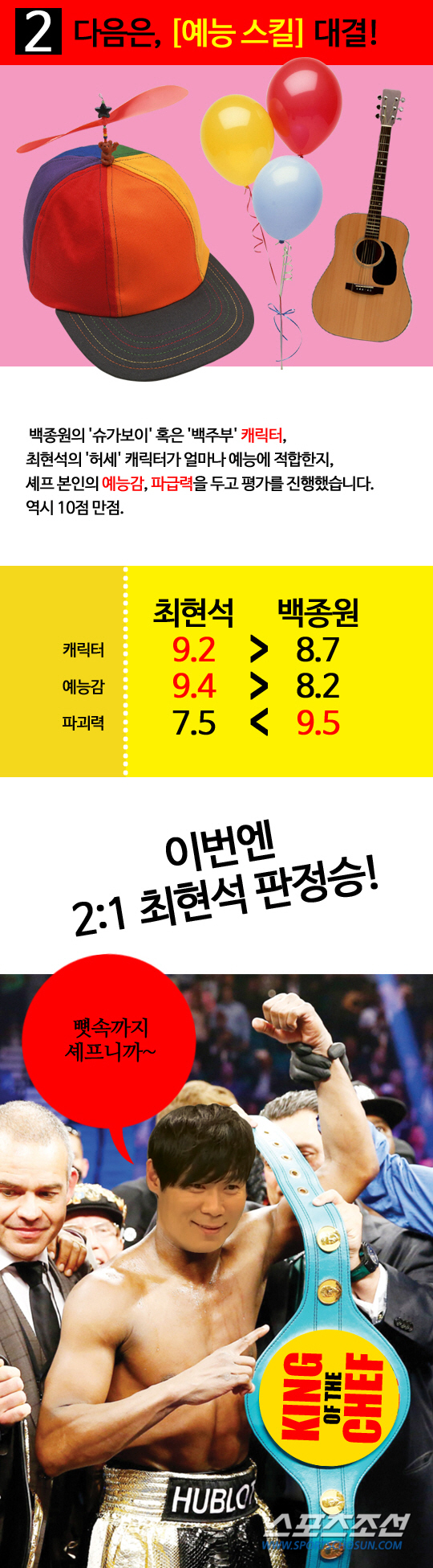 예능 스킬에서는 최현석이 2대 1로 백종원을 꺾었다.
