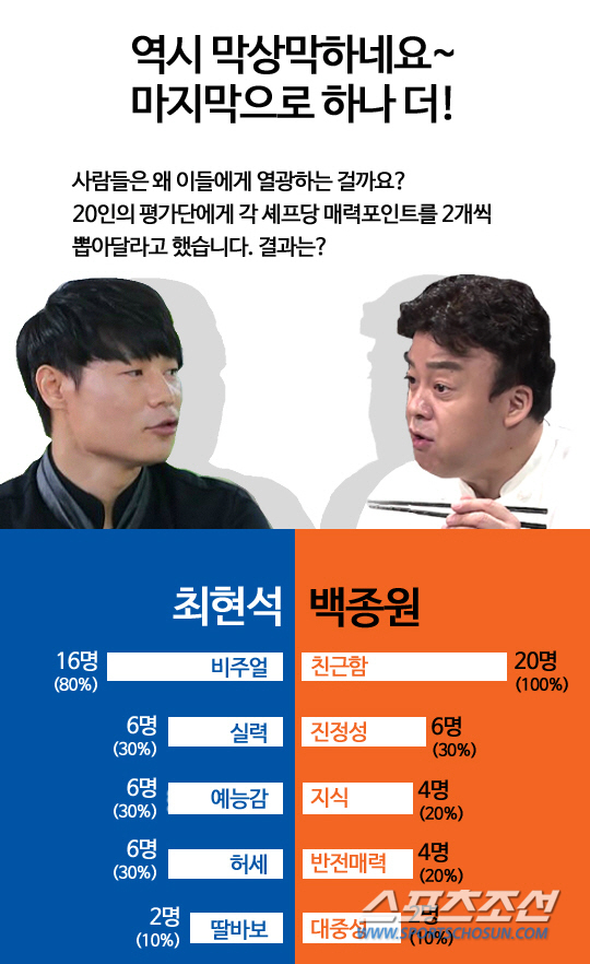 어찌됐건 최현석과 백종원 모두 대단한 요리인임은 분명하다. 그렇다면 사람들은 왜 이들에게 열광하는 걸까. 20인의 평가단에게 각 셰프당 매력포인트를 2개씩 뽑아달라고 했다. 백종원의 경우 친근함(100%)이 가장 큰 매력포인트로 꼽힌다. 구수한 충청도 사투리를 쓰는 동네 아저씨가 실수를 연발해가면서도 맛있는 음식을 해주는 것 같은 친근감이 느껴진다고. 이밖에 아내 소유진을 향한 변함없는 애정과 사람들과 진심으로 소통하고 있다는 진정성(30%), '한식대첩'에서 보여주는 어마어마한 요리 지식들(20%), 동네 아저씨처럼 보이지만 사실은 대성한 요리 사업가라는 반전 매력(20%), 대중성(10%) 등이 매력 포인트로 꼽혔다.