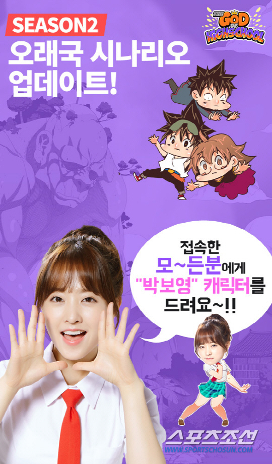 마지막으로 '갓 오브 하이스쿨'의 홍보모델인 배우 박보영의 캐릭터가 추가됐다. '갓 오브 하이스쿨'은 박보영 캐릭터 추가를 기념해 성장 이벤트를 오는 31일(금)까지 실시한다. 게임에 접속하는 유저 전원에게 [일반]박보영 캐릭터를 지급하고, [일반]?[진] 캐릭터 4성 최대 레벨 달성 시 영혼석 30개를, 캐릭터 5성 최대 레벨 달성 시 영혼석 100개를 증정한다.