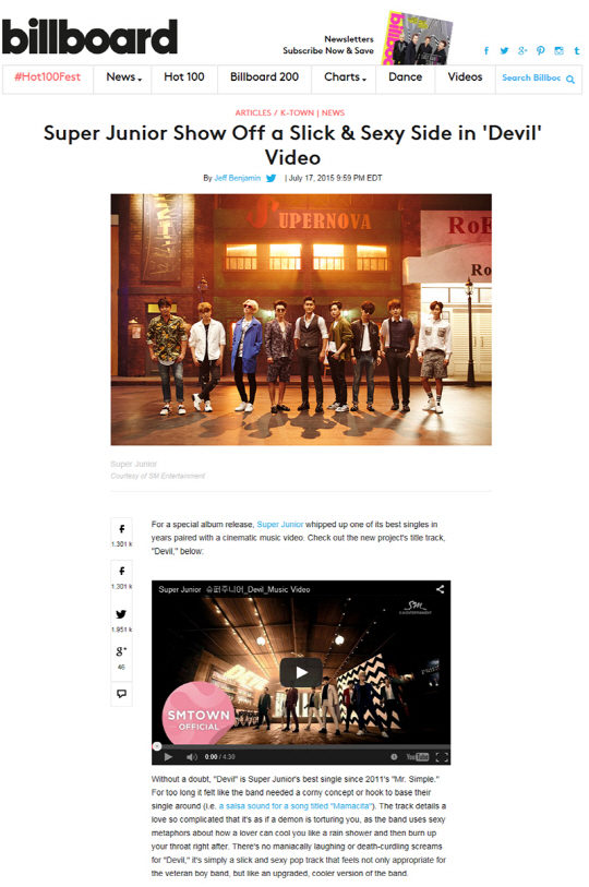 미국 유명 매체 빌보드는 지난 17일(현지시각) K팝 칼럼 코너 K-TOWN을 통해 "슈퍼주니어, 'Devil' 뮤직비디오 통해 능수능란함과 섹시함을 과시하다(Super Junior Show Off a Slick & Sexy Side in 'Devil' Video)"라는 제목의 기사를 게재하고 슈퍼주니어의 신곡과 뮤직비디오를 상세히 소개해, 슈퍼주니어의 글로벌한 위상을 다시 한번 실감케 했다.