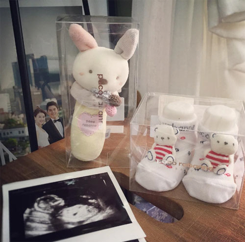 함께 공개한 사진에는 결혼 사진을 배경으로 아기를 기다리는 예쁜 양말과 토끼 인형이 담겨있다.