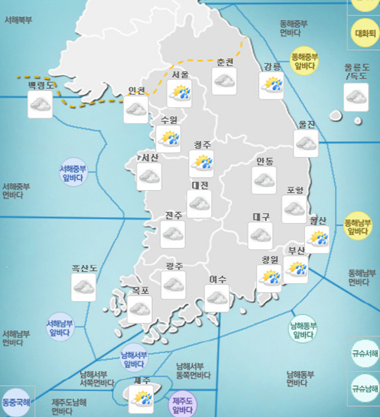22일 전국이 동해상에 위치한 고기압 가장자리에 들어 대체로 흐릴 전망이다.