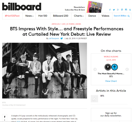 빌보드는 "대부분의 K-POP 공연은 꼼꼼하게 리허설된 안무와 마치 CD를 틀어놓은 듯한 보컬로 매 공연이 이루어진다. 방탄소년단의 무대 또한 마찬가지였지만, 이들이 보여준 한층 더 여유롭고 자유로운 모습은 이들의 뉴욕 데뷔 무대를 잊지 못하게끔 만들었다"라고 소개하며 지난 16일 펼쳐진 방탄소년단의 미국 데뷔 무대인 뉴욕 투어를 호평했다.