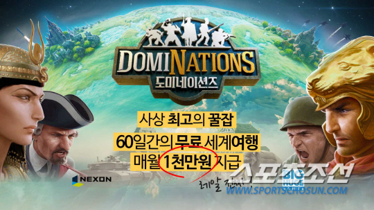 넥슨은 빅휴즈게임즈가 개발하고 자사가 서비스 예정인 모바일 전략게임 '도미네이션즈(DomiNations)'에서 60일간의 무료 세계 여행과 매월 1000만원 혜택을 제공하는 '사상 최고의 꿀잡' 프로모션을 실시한다고 밝혔다.
