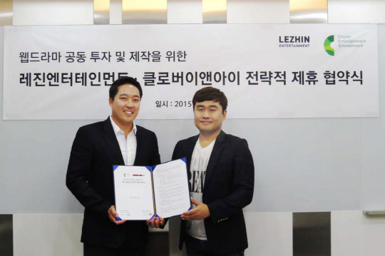 모바일 콘텐츠 기업 클로버 이앤아이 (대표 김영욱)와 프리미엄 만화 레진코믹스를 운영 중인 레진엔터테인먼트가 21일 웹툰과 만화의 영상화를 위한 전략적 제휴를 체결했다. 사진제공=클로버이앤아이