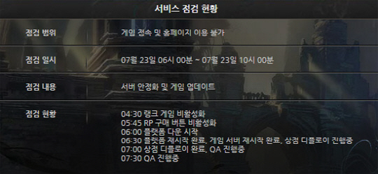 오전 4시 30분 랭크 게임 비활성화 됐으며, 오전 7시 30분 QA 진행 중이다. <스포츠조선닷컴>