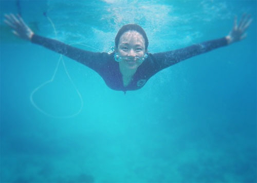 야노시호는 물속으로 풍덩 뛰어 들어오며 숨을 내쉬어 코 옆에 공기방울이 생긴 우스꽝스러운 모습도 숨기지 않았다.