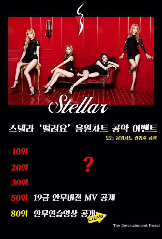 스텔라는 22일 공식 SNS를 통해 "스텔라 '떨려요' 차트 공약 이벤트를 진행합니다. 순위가 올라갈수록 엄청난 공약들이 공개될 예정"이라고 밝혔다. 이후 같은 날 음원 사이트 멜론에서 73위를 기록하자 24일 80위 진입 차트 공약으로 내건 '떨려요' 안무연습 영상을 공개한 것. 공개된 영상에서 멤버들은 그동안 보여줬던 섹시한 모습과 달리 청순한 외모를 뽐내 눈길을 끌었다.