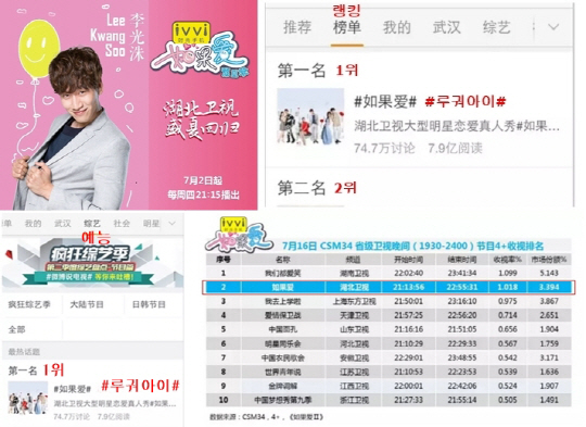 이광수가 출연하는 중국 호북위성TV 예능 프로그램 '루궈아이'는 16일 웨이보 랭킹 1위를 기록하며 시청률 1%를 넘어섰다. 지난 2일 첫 방송된 '루궈아이'는 CJ E&M 차이나와 중국 호북위성TV가 공동 제작한 예능 프로그램으로 종려시 슝다이린 등 중국어권 톱스타들이 대거 출연한다. 이광수는 외국인으로서는 유일하게 합류해 화제를 모았다.