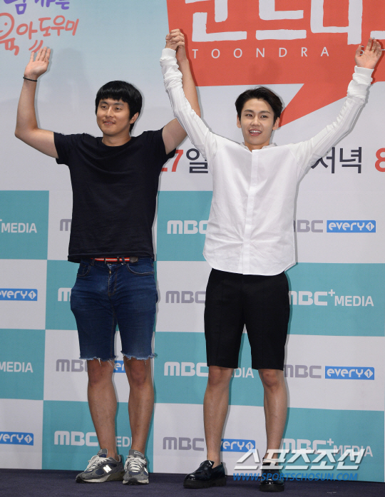 24일 서울 여의도 IFC몰 CGV에서 MBC에브리원 웹툰드라마 '웹툰히어로-툰드라쇼' 제작발표회가 열렸다. '웹툰 히어로-툰드라쇼'는 특유의 개성이 흠뻑 묻어나는 웹툰 작가와 드라마라가 결합 된 포맷으로 3명의 인기 웹툰 작가가 자신의 이름을 걸고 각자의 코너를 기획, 출연까지 하는 새로운 장르이며, 7월 27일 월요일 오후 8시 40분 첫 방송 될 예정이다. 제작발표회에 참석해 포즈를 취하고 있는 기안84 작가와 정일훈. 송정헌 기자 songs@sportschosun.com/2015.07.24