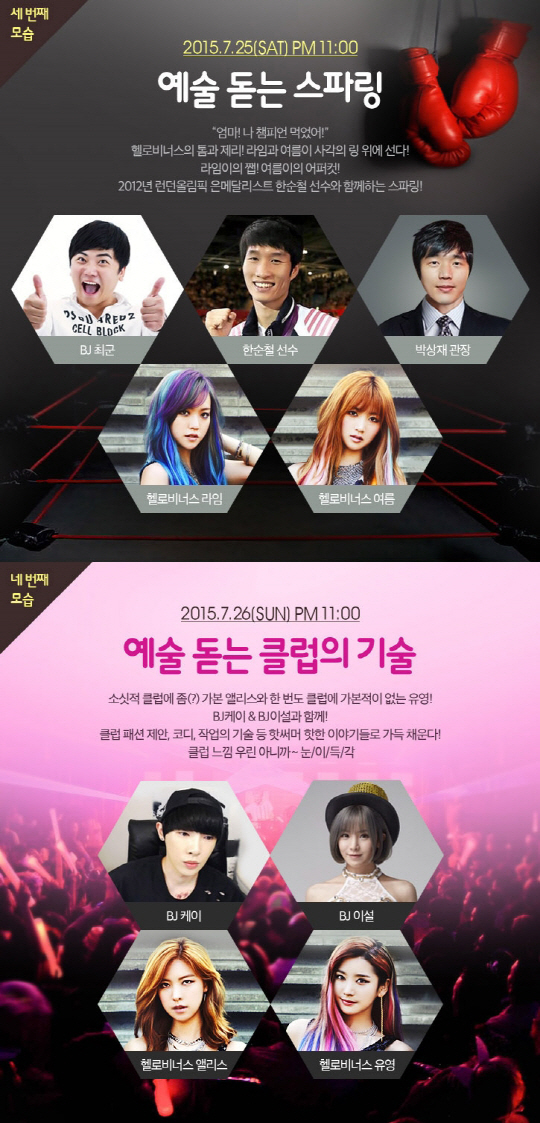 헬로비너스는 23일부터 4일간 매일밤 11시 아프리카TV '헬로비너스UP'으로 푸드, 스포츠, 클럽 문화 등 파격적이고 다양한 주제를 가지고 릴레이 생중계를 시작했다.