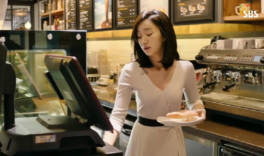 카페에서 서빙을 하는 모습까지 우아한 그녀, 드레수애의 시그니처 아이템은 뭐니뭐니 해도 촤르르 떨어지는 랩 드레스입니다. 부드러운 소재로 우아하게 잡히는 주름라인이 매력적일 뿐 아니라 허리의 블랙 리본으로 소녀감성까지 더했어요. 깔끔한 아이보리 색감과 깊게 파진 V 네크라인이 여성미를 최대한 이끌어내네요. DVF 제품.
