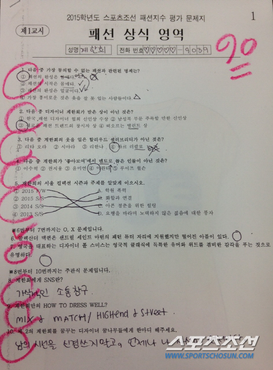 계한희 디자이너가 푼 2015학년도 스포츠조선 패션지수 평가 문제지 패션상식영역. 그 첫 번째 문제는 단골출제 문항인 '가장 동의할 수 없는 패션과 관련된 명제'다. 그는 '패션의 완성은 몸매다'라고 말했다. 패완얼 타파를 말하는 건가 했는데, 패션의 시작은 몸매이고 패션의 완성은 얼굴이지만, 패션의 완성은 몸매가 아니라는 솔직한 답을 내놓아 한바탕 웃게 됐다.