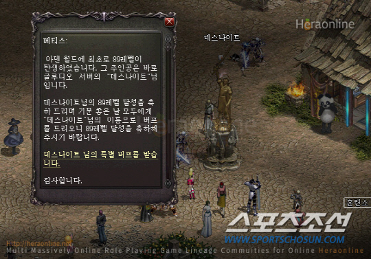 글루디오 서버 데스나이트의 89레벨은 지난 26일 오전 10시 30분경으로 추정되고 있으며 전 서버 기란 마을에는 이를 기념하고 축하하기 위해 '데스나이트' 이름으로 된 버프 동상이 3일간 놓여지게 된다. 글루디오 서버 게시판에는 89레벨업 달성을 축하하는 유저들의 축하 메세지도 이어지고 있다.