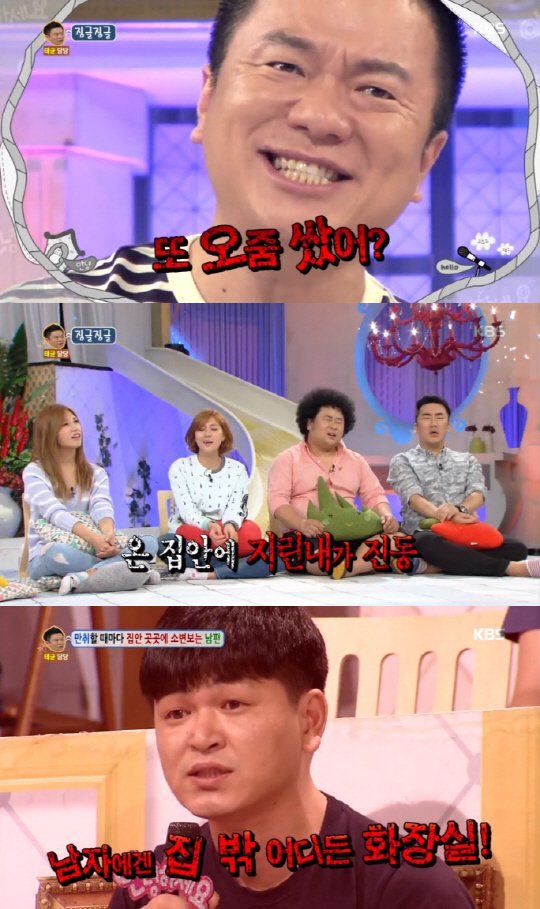 이날 MC 김태균은 "남편이 술을 마시면 집안을 온통 오줌 바다로 만든다"는 사연을 읽었다. 김태균은 "온 집안에 지린내가 진동을 한다. 그 흔적을 치울 때마다 화가 난다. 그런데 남편은 '내가 또 쌌어? 남자들은 술마시면 원래 다 그래'라고 당당한 태도를 보인다"며 "하루는 중학생 딸의 교복에 소변을 봐서 딸은 겨울에 하복 교복을 입고 등교했다. 또 작은 딸의 가방에도 실례를 했었다"고 전해 모두를 충격에 빠트렸다.