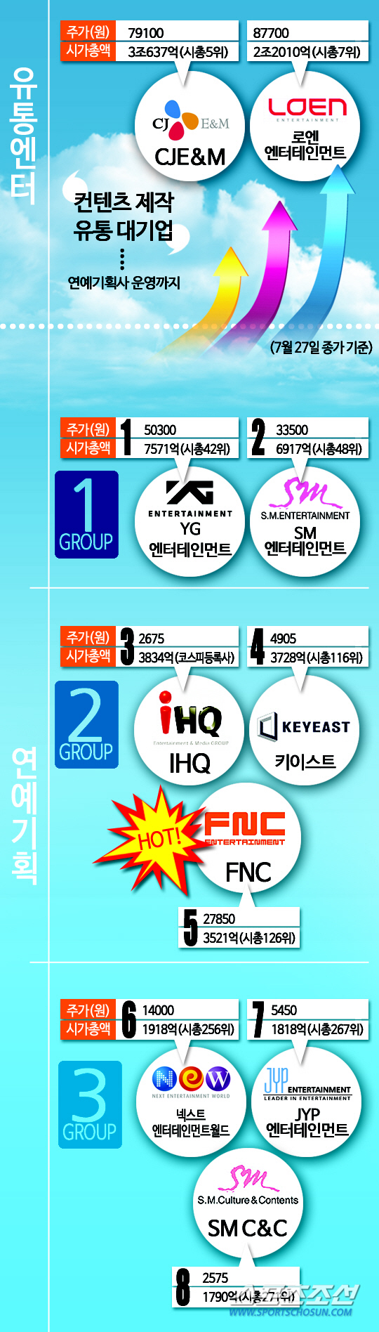 JYP가 3그룹에 있다는 점이 놀랍다. 시총만으로 봤을 때 음반기획 트로이카 자리는 FNC에게 넘겨준 것이 확실하다.