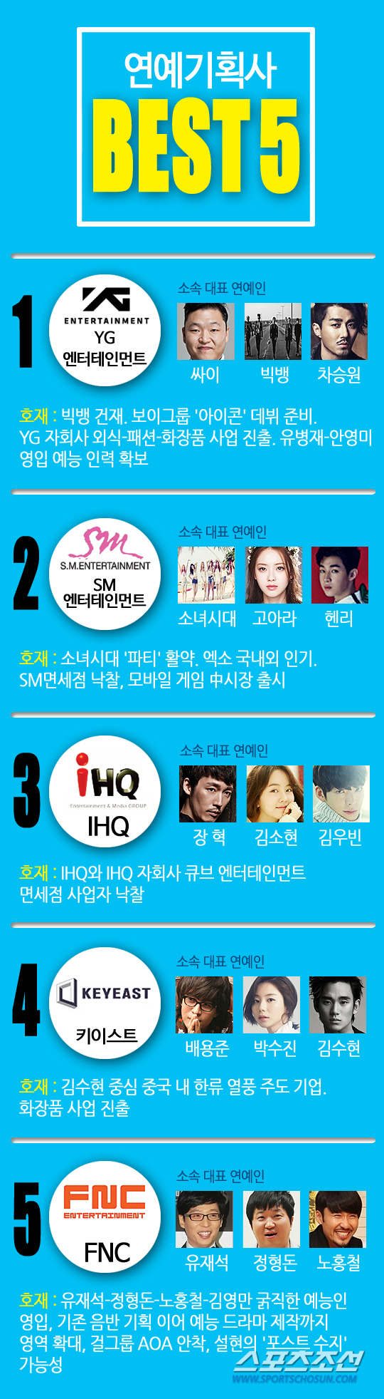 연예매니지먼트만을 중심으로 순위를 가르자면 단연 YG-SM 투톱 1,2위다.