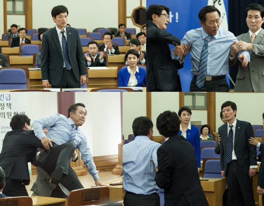 공개된 사진 속 이원재는 만류하는 의원들에 아랑곳 않고 넥타이를 풀고 웃통까지 벗어 제끼며 화가 머리 끝까지 치민 모습을 연출하고 있다. 이에 정재영도 의석을 박차고 일어나 있는 힘껏 노려보며 격한 설전을 이어가는 상황. 결국 끝까지 대드는 정재영에 참다 못한 이원재는 몸을 던져 발차기까지 날리는 웃지 못할 촌극으로 과거 정치판의 부끄러운 자화상을 재현해내고 있다.