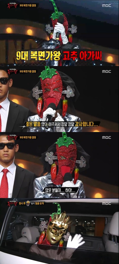 고추아가씨는 9대 가왕에 등극하자 "정말 상상도 못했다. 그냥 이 무대를 준비하는 것만으로도 굉장히 너무 행복했었는데 많은 분들이 절 선택해주셔서 너무 감사드린다"며 "좋은 말씀 많이 해주셔서 감사하다. 좋은 모습 많이 보여드리겠다"고 눈물을 흘렸다. <스포츠조선닷컴>