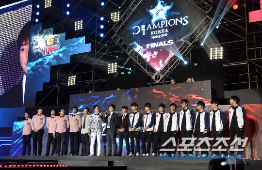지난 5월 서울 삼성동 코엑스에서 열린 '리그 오브 레전드 챔피언스 코리아' 스프링 시즌 결승에서 SKT T1 선수들과 KOO 타이거즈 선수들이 인터뷰를 하는 모습. 사진제공=라이엇게임즈