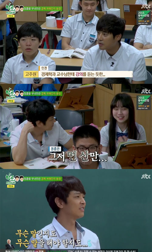 서강대 경제학과 출신인 고주원은 수업에 집중했고, 반 친구의 발표가 끝나자 경제 용어들을 써가며 거침없이 질문했다. 반면 옆에 있던 김정훈은 "무슨 소리인 줄 하나도 모르겠다"며 절망하는 모습을 보여 웃음을 안겼다. <스포츠조선닷컴 정유나 기자>