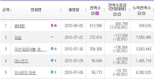 '베테랑'은 안하무인 유아독존 재벌 3세를 쫓는 베테랑 광역수사대의 활약을 그린 범죄오락액션이다. '베테랑'이 한 주 앞서 개봉하여 흥행을 이어가고 있는 톰 크루즈 주연의 할리우드 블록버스터 '미션 임파서블 : 로그네이션'과 한국 영화 '암살' 등 쟁쟁한 경쟁작들을 압도적 격차로 모두 제친 것.