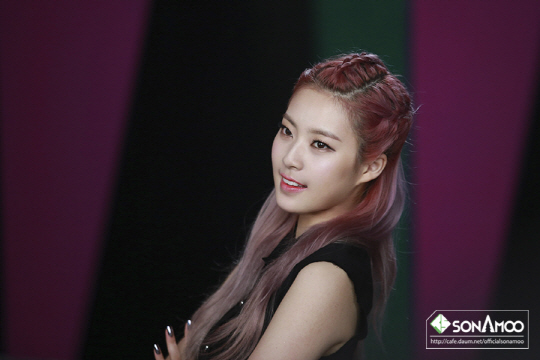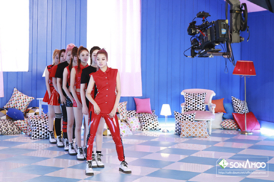 본격적인 무대 시작 전 일곱 명의 소녀들이 일렬로 서있는 사진은 강렬한 의상으로 보는 이의 시선을 강탈한다. 광택이 나는 인조 가죽 소재 무대 의상은 소나무만의 유니크함을 살리는 동시에 완벽한 레드 컬러로 깊은 인상을 남긴다.