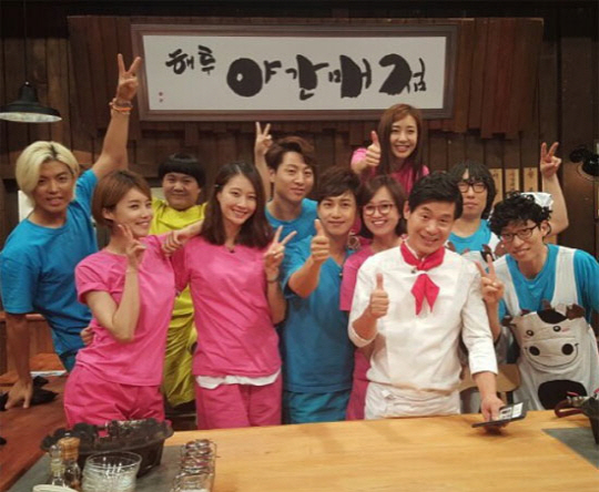 공개한 사진에는 이현이와 해피투게더 멤버들을 비롯해 김원준, 이아현, 유상무, 장도연, 강남 이연복 셰프 등의 모습이 담겨있다. 사우나 복장을 한 이현이와 함께 브이를 그리며 해맑은 미소를 보이고 있다.