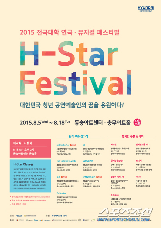 전국 최대 규모의 대학생 공연예술 축제인 2015 H-스타 페스티벌(현대자동차그룹, 한국공연프로듀서협회 주최)이 지난 5일 화려한 막을 올렸다.