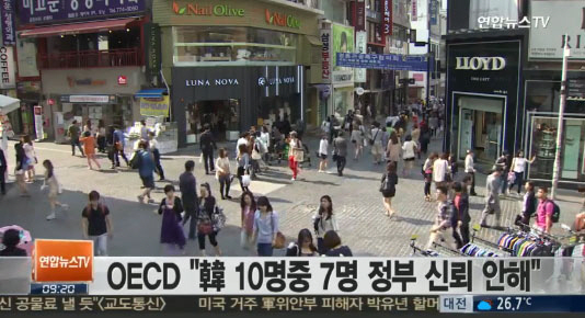 9일 경제협력개발기구(OECD)의 '한눈에 보는 정부 2015'(Government at a Glance 2015) 보고서에 따르면 2014년 기준 한국 정부에 대한 국민의 신뢰도는 34%로 조사 대상 41개국 가운데 중하위권인 26위에 머물렀다.