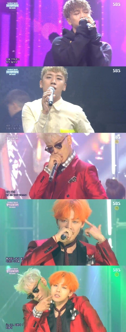 빅뱅은 9일 방송된 SBS '인기가요'에서 '우리 사랑하지 말아요'와 '쩔어' 무대를 처음으로 선보였다.