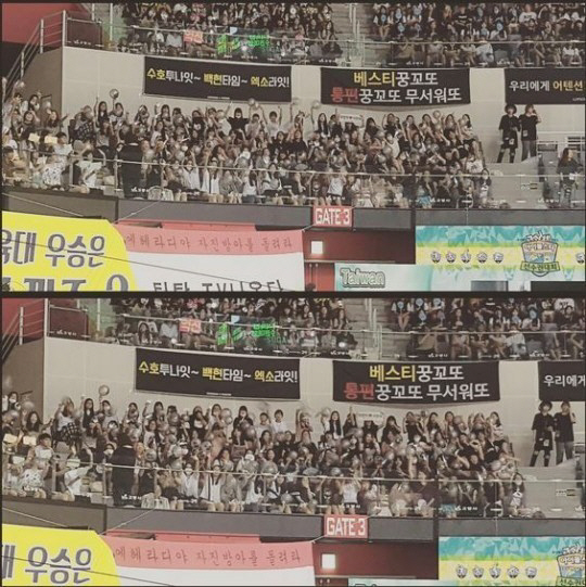 공개한 사진에는 MBC '2015 아이돌스타 육상·농구·풋살·양궁 선수권대회'(이하 '아육대')에 참가한 백현을 응원하기 위해 체육관을 찾은 팬들의 모습이 담겨있다. 특히 팬들은 풍선과 현수막을 내걸고 열띤 응원을 펼치고 있어 눈길을 끈다.