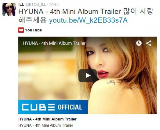 일훈은 10일 자신의 트위터를 통해 "현아(HYUNA) ? 4번째 미니 앨범 트레일러 (4th Mini Album Trailer) 많이 사랑해주세요"라며 현아의 트레일러 영상을 링크했다.