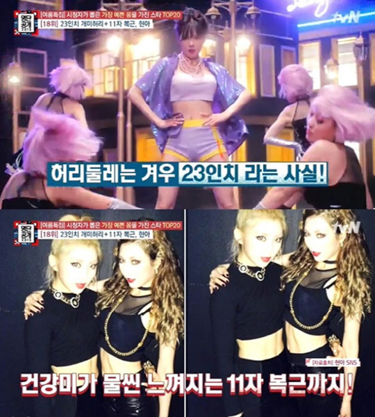 이 중 포미닛 현아는 18위를 차지했다. 마른 몸매를 가진 현아의 허리 사이즈는 23인치이지만, 건강미의 상징인 11자 복근까지 완성해 흠 잡을 데 없는 퍼펙트한 몸매를 자랑한다.