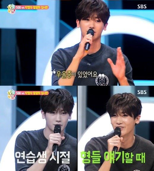 10일 방송된 SBS '힐링캠프'에는 제국의아이들 박형식 임시완 광희가 출연했다. 이날 박형식은 왕따 경험부터 우울증을 앓았던 과거까지 진솔한 고백으로 눈길을 끌었다. 그는 "전에 다른 회사에 있었는데 저를 캐스팅한 매니저분과 얘기를 하다 친해졌다. 그런데 다른 연습생들이 보기엔 아부떠는 것 같아 보였나보더라. 나와 밥도 같이 안 먹고 말을 걸어도 못 들은 척 했다. 그때부터 나 혼자만 잘하면 된다고 생각했다. 실제로 우울증이 있었다"고 털어놨다. 이어 "이후 회사를 옮겼는데 나만 잘하면 된다고 생각해서 한평짜리 방에서 발라드만 불렀다. 그때 리더형(문준영)이 나를 꺼내줬다. 다시 밝아졌고 내가 더 멤버들을 좋아하게 됐다. 할 수 있는 건 열심히 하는 것 밖에 없었는데 처음 찾아온 게 '진짜 사나이'였다. 그렇게 열심히 해서 하나하나 기회를 잡기 시작했다. 나는 0이었기 때문에 아쉬울 것도 잃을 것도 없었다. 하나씩 쌓아가고 싶다"고 전했다.