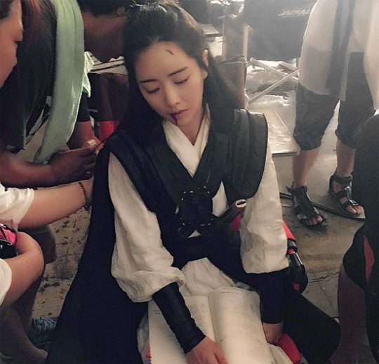 공개한 사진에는 포졸복을 입고 눈을 감고 있는 홍수아의 모습이 담겨있다. 피곤한 밤샘 촬영에도 빛나는 피부와 미모를 자랑하고 있어 눈길을 끈다.