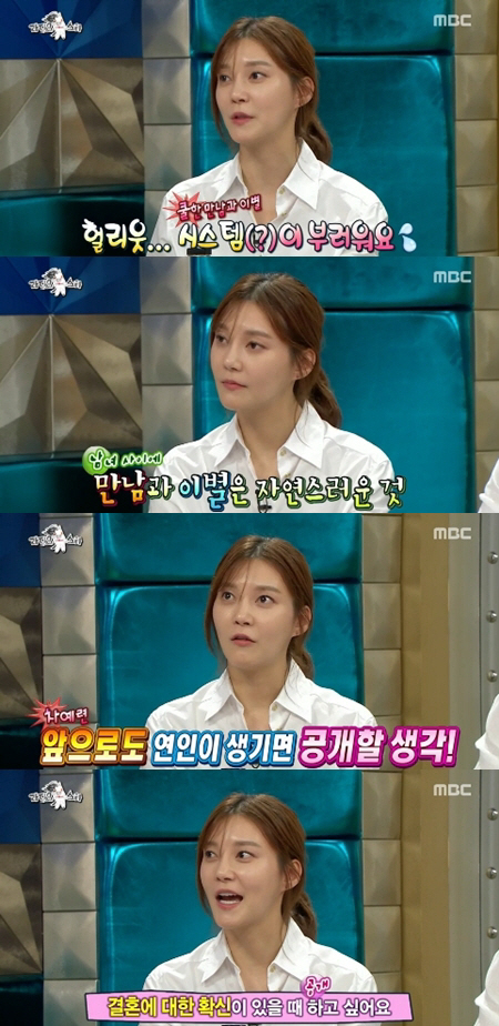 이날 차예련은 "유지태처럼 키 큰 남자를 좋아한다"고 자신의 이성 스타일을 밝혔다. 이에 김구라가 "혹시 연예인하고 공개연애 한 적 있냐?"고 물었고, 차예련은 "있긴 있었는데"라며 당황했다.