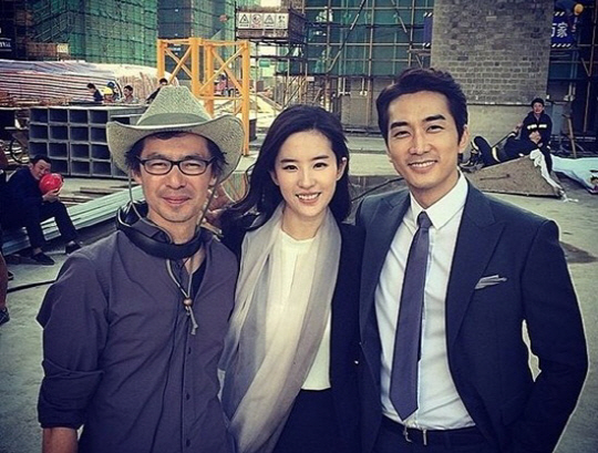 사진 속 배경은 공사 현장으로 영화 '제 3의 사랑' 촬영 장소의 한 장면으로 보인다.