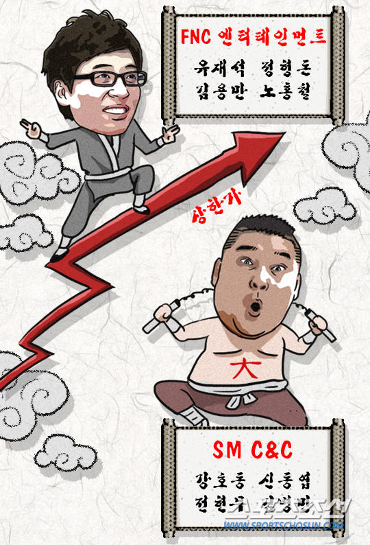 FNC는 최근 가장 무섭게 성장한 당파라 하겠다. 가수 기획사로 시작한 FNC는 배우부터 거물급 예능인들까지 차례로 품으며 방송가에서 가장 영향력 있는 '예능 왕국'으로 거듭나고 있다. FNC가 가장 뜨거운 당파가 된 이유는 모든 당파가 눈독 들이던 유재석의 영입 덕이다. 유재석의 합류 소식이 전해진 날 FNC의 주가 또한 요동쳤다. 유재석은 5년 동안 어느 당파에도 속하지 않고 독자적으로 활동했다. 무림의 치열한 눈치 싸움을 끝에 최종 승자는 FNC가 됐다. FNC는 유재석에 앞서 예능 4대천왕에 등극한 정형돈까지 차지하며 부지불식간에 예능계 강자로 떠올랐다. 자숙중인 '잠룡' 김용만과 노홍철과도 전속 계약을 체결해 당장 눈앞의 예능 판도가 아닌 멀리까지 내다보겠다는 야심을 내비치고 있다.