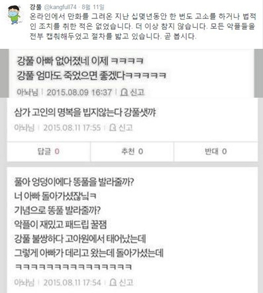 강풀은 최근 부친상을 당했다. 문제의 악플러는 강풀의 부친상 사실을 비꼬는 악플로 비수를 꽂고 있다.