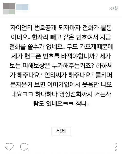 공개된 게시글에는 "자이언티 번호 공개 되자마자 전화가 불통이네요. 한 자리 빼고 다 같은 번호여서 지금 전화를 쓸 수가 없네요"라고 적혀 있다.